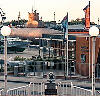 Es befindet sich in unmittelbarer Nähe des heutigen Marinestützpunktes. Den besten Blick durch die Kamera haben Sie direkt auf der Mole oder am Ufer, direkt zwischen der Absperrung zum Marinestützpunkt und der Mole.