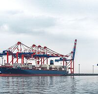 © Rainer Ganske Im Jahr 2012 wurde der Container Terminal Wilhelmshaven in Betrieb genommen, Schiffe von einer Länge bis 430 m und Tiefgang bis 16,5 m können den einzigen Tiefwasserhafen Deutschlands tideunabhängig anfahren.